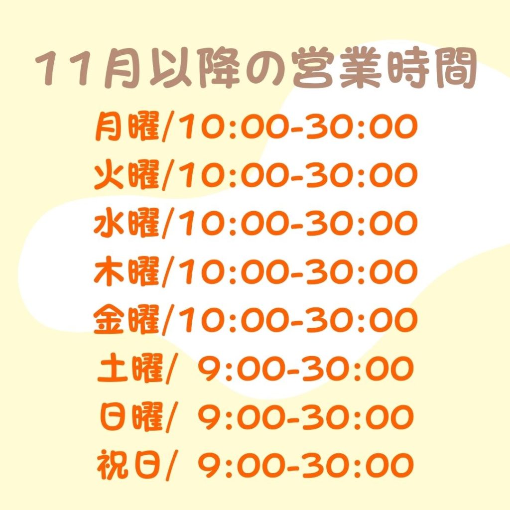 11/3(水)より営業時間を下記、画像の通り変更させていただきます。