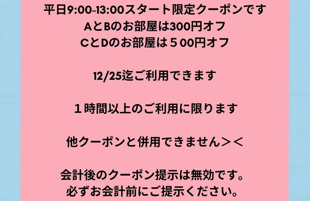 大好評でした300円オフに加え、CとDの大きなお部屋はなんと500円わりびきです!