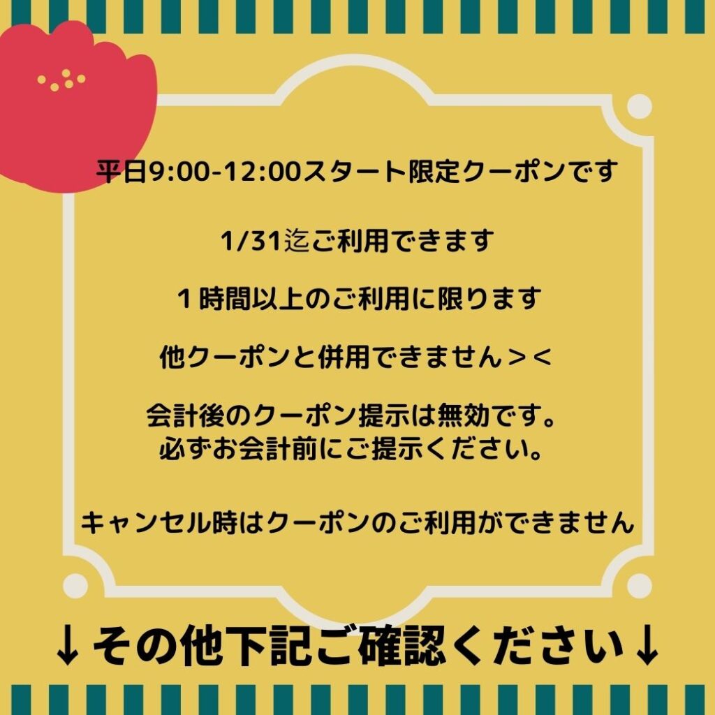 【1/25〜2/5】平日9:00-13:00スタートで300円/30分!