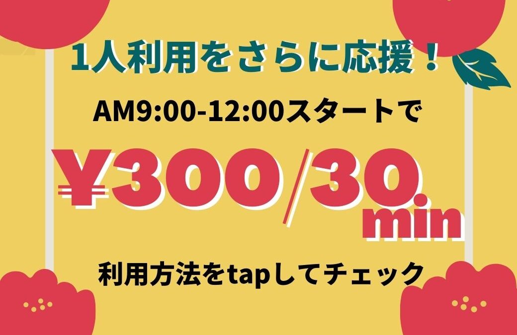 【1/25〜2/5】平日9:00-13:00スタートで300円/30分!