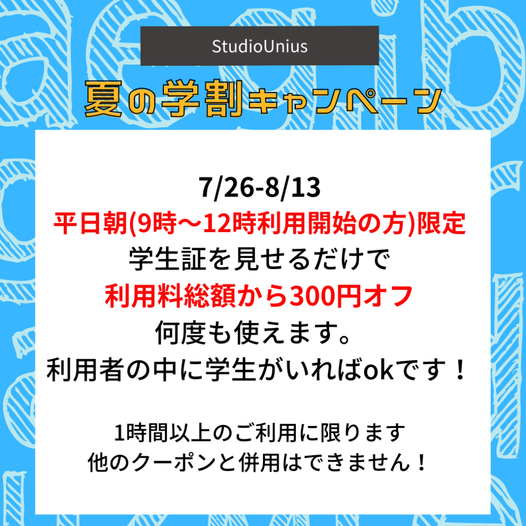 渋谷駅徒歩1分!渋谷スタジオユニアスから夏の学割クーポンを配布します!🔥