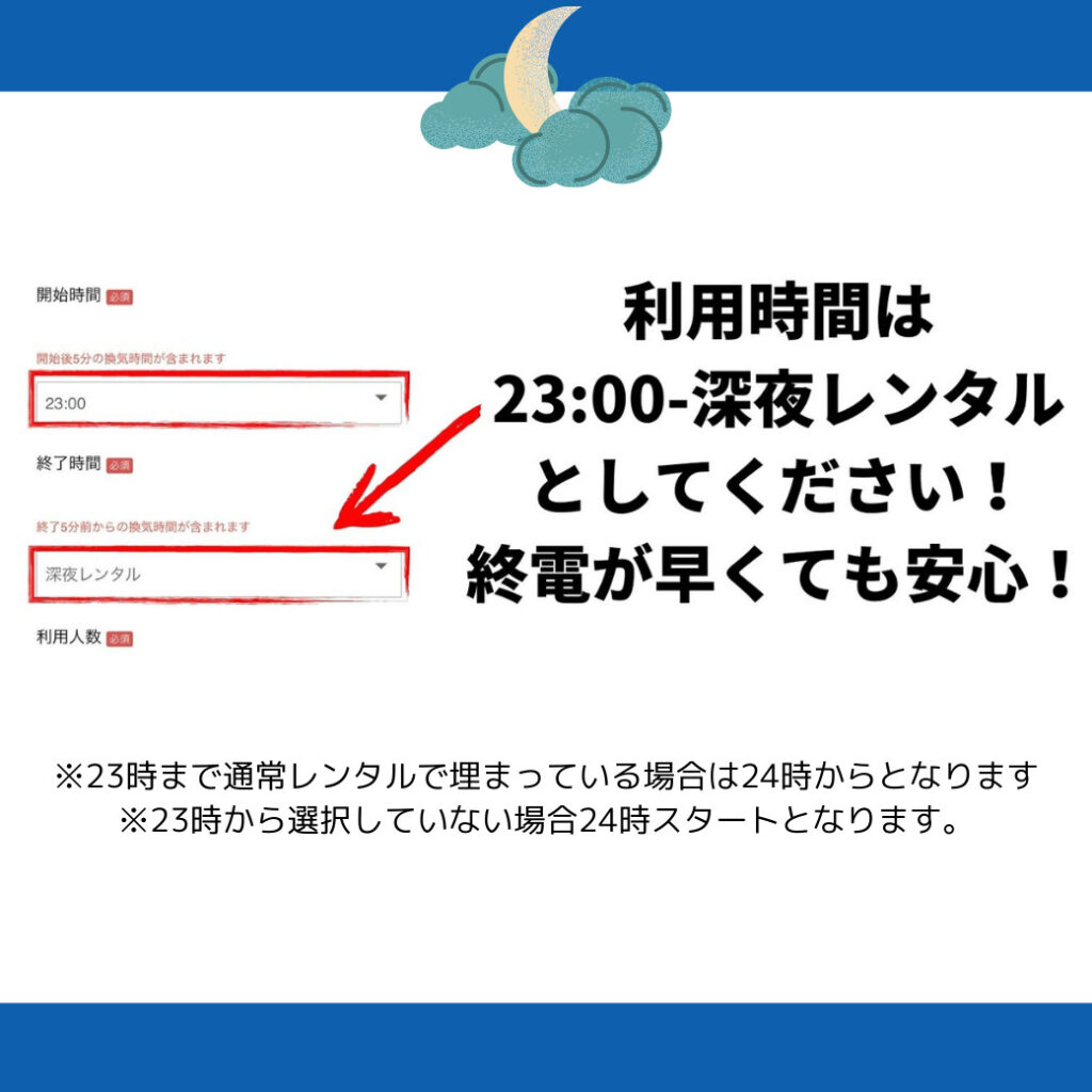 ※23時まで通常レンタルで埋まっている場合は24時からとなります