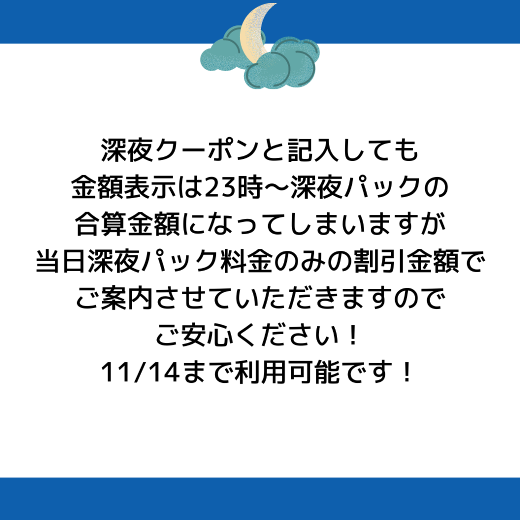 9/1(水)~10/24(日) 11/14(日)(好評につき延長が決定しました!)までのご利用で平日祝日関係なく深夜の割引キャンペーンを開催!