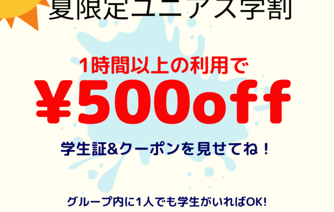 【キャンペーン】夏限定! ユニアス学割¥500オフ(9/30まで)