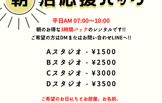 [朝活応援パック]こんにちは!スタジオユニアスです!お得な朝活パックのお知らせです! 平日…